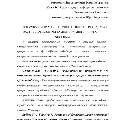 Стаття 2018/07/16Формування фахової компетентності перекладача із застосуванням програмного комплексу «Діалог Nibelung»