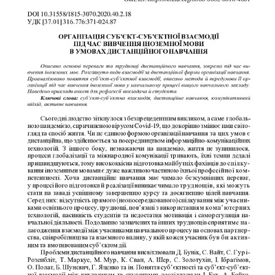 Стаття 2021/10/12Організація суб’єкт-суб’єктної взаємодії під час вивчення іноземної мови в умовах дистанційного навчання