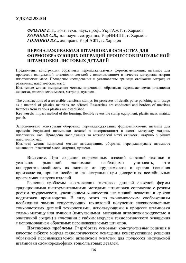 Предложены конструкции обратимых переналаживаемых формоизменяющих штампов для процессов импульсной штамповки деталей с использованием в качестве материала матриц пластических масс. Проведены исслед...