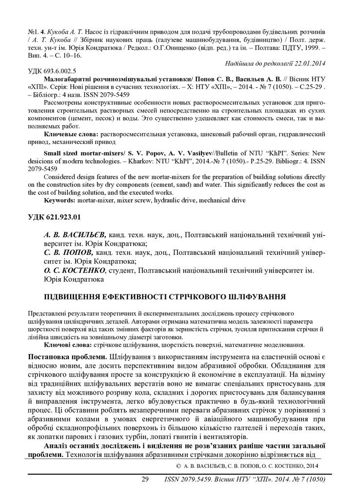 Представлені результати теоретичних й експериментальних досліджень процесу стрічкового шліфування...
