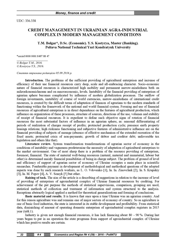 Tetyana Bolgar, D.Sc.(Economics). Yaroslav Kostirya, master's degree of speciality «banking». Poltava National Technical Yuri Kondratyuka University. «Credit management in Ukrainian agroindustria c...