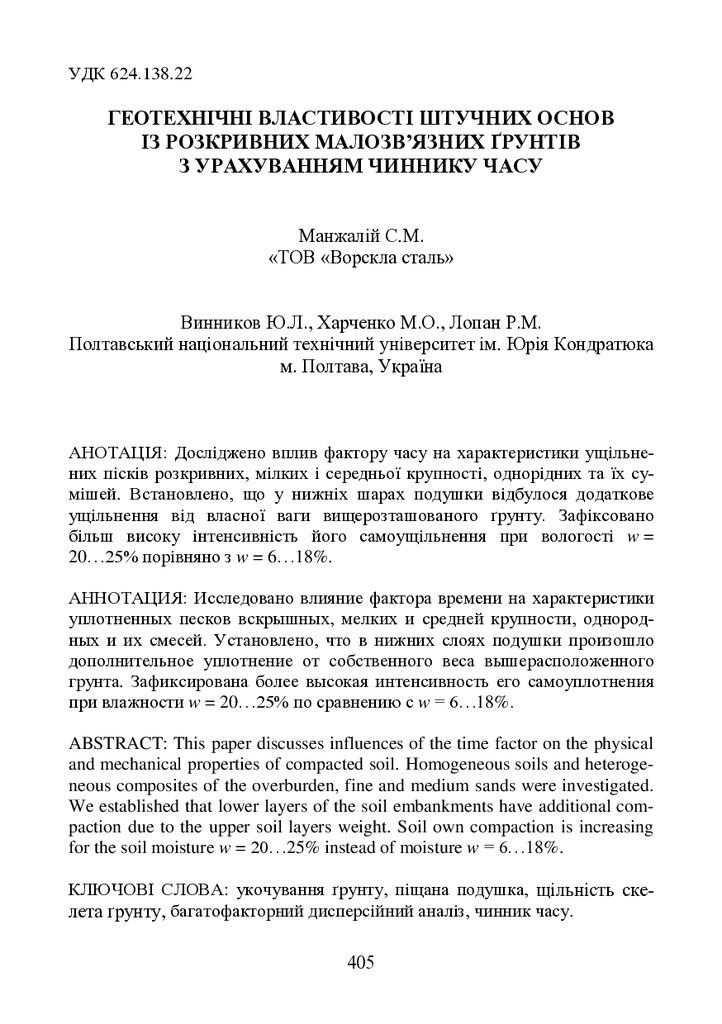 Стаття 2020/05/29Геотехнічні властивості штучних основ із розкривних малозв’язних грунтів з урахуванням чинника часу