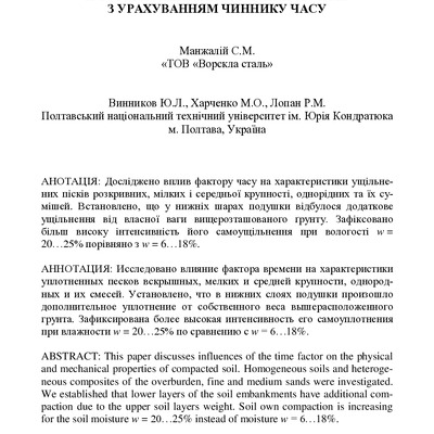 Досліджено вплив фактору часу на характеристики ущільнених пісків розкривних, мілких і середньої ...