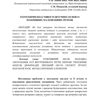 Стаття 2020/07/06Геотехнічні властивості штучних основ із розкривних малозв'язних ґрунтів