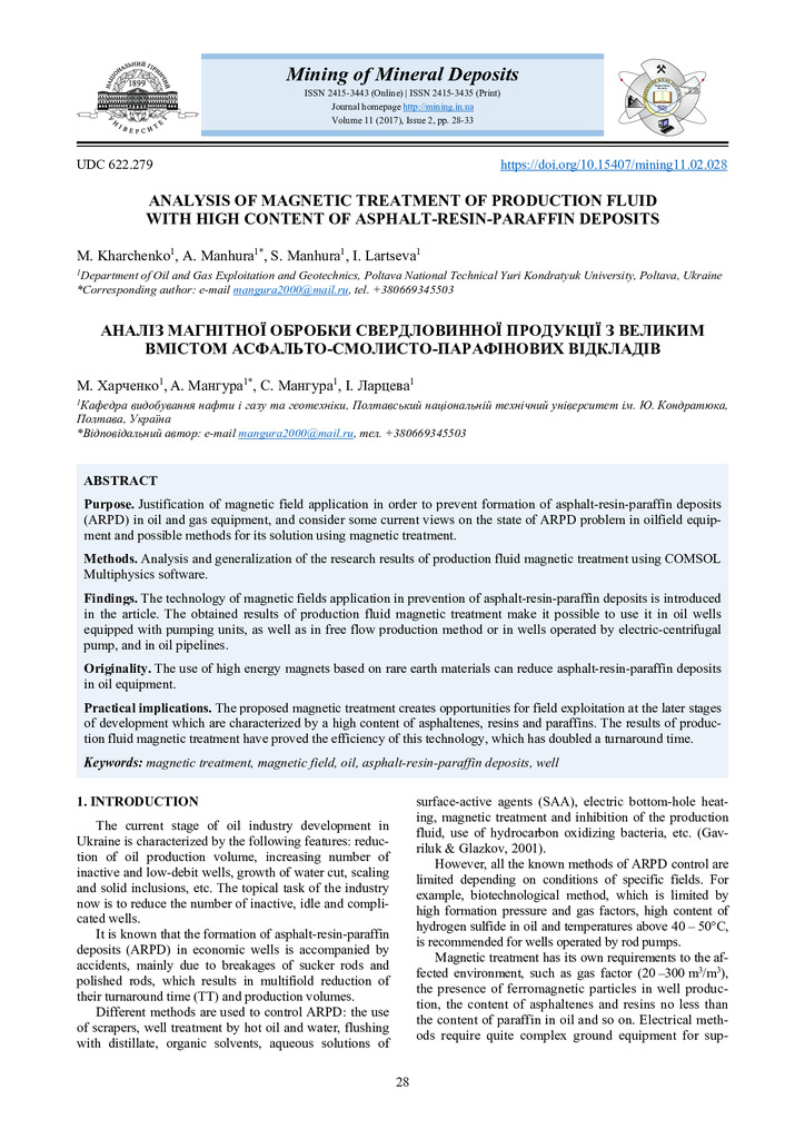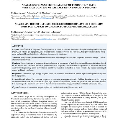 Стаття 2020/07/09Analysis of magnetic treatment of production fluid with high content of asphalt-resin-paraffin deposits