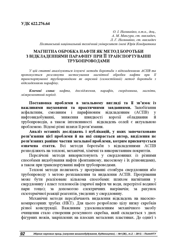 Магнітна обробка нафти як метод боротьби з відкладеннями парафіну при її транспортуванні трубопроводами
