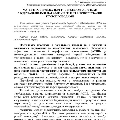 Стаття 2020/07/09Магнітна обробка нафти як метод боротьби з відкладеннями парафіну при її транспортуванні трубопроводами
