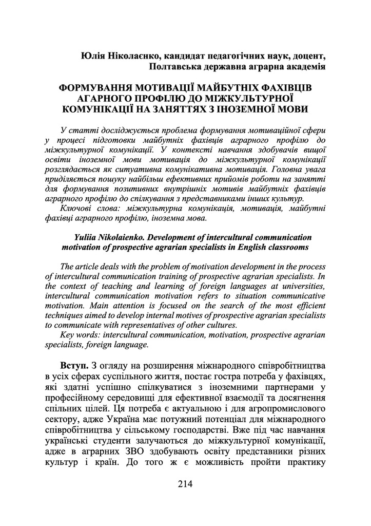 2022/02/17Формування мотивації майбутніх фахівців аграрного профілю до міжкультурної комунікації на заняттях з іноземної мови