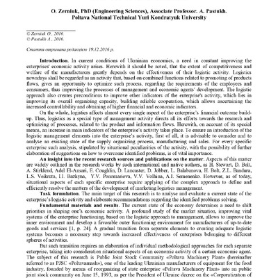 In article the authors define the role of logistics in the modern industrial enterprise in a highly competitive environment. The analysis of the current state of logistics conducted at PJSC «Polta...
