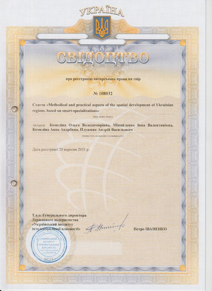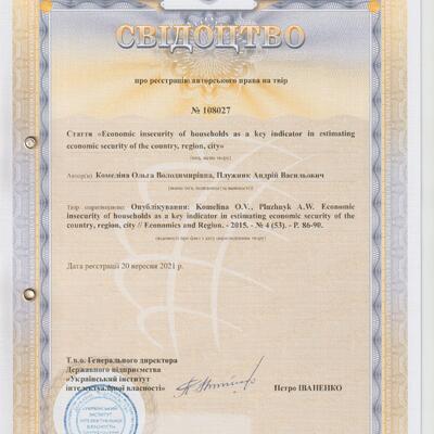 Свідоцтво про реєстрацію авторського права № 108027 на твір «Economic insecurity of households as a key indicator in estimating economic security of the country, region, city»