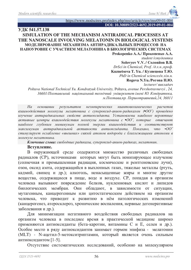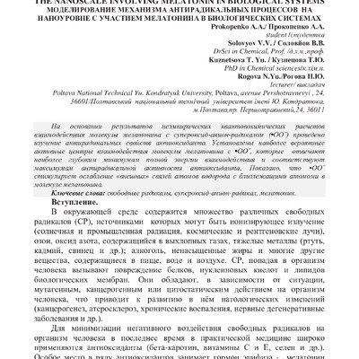 Стаття 2019/12/09Моделирование механизма антирадикальных процессов на наноуровне с участием мелатонина в биологических системах