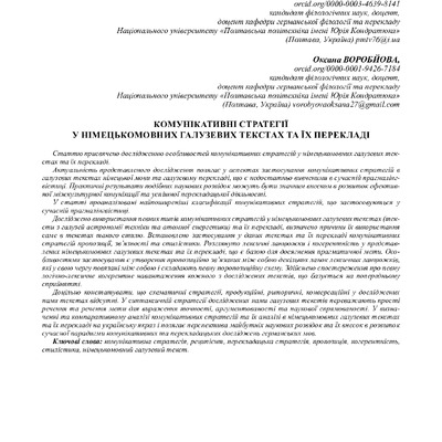 Стаття 2024/05/21Комунікативні стратегії у німецькомовних галузевих текстах та їх перекладі