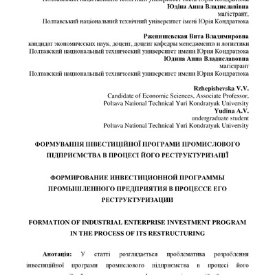 Стаття 2016/06/15Формування інвестиційної програми промислового підприємства в процесі його реструктиризації