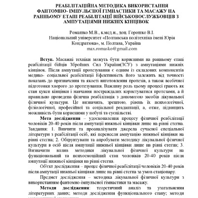 Стаття 2023/12/08Реабілітаційна методика використання фантомно-імпульсної гімнастики та масажу на ранньому етапі реабілітації військовослужбовців з ампутаціями нижніх кінцівок
