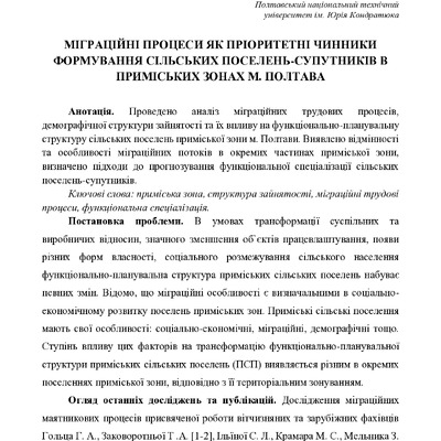 Стаття 2019/02/15Міграційні процеси як пріоритетні чинники формування сільських поселень-супутників в приміських зонах м. Полтава