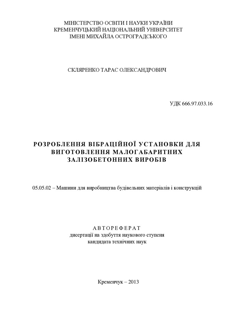 У дисертації викладено результати теоретичного та експериментального дослідження параметрів установки для виготовлення малогабаритних залізобетонних виробів. Проведено огляд та аналіз досліджень ...