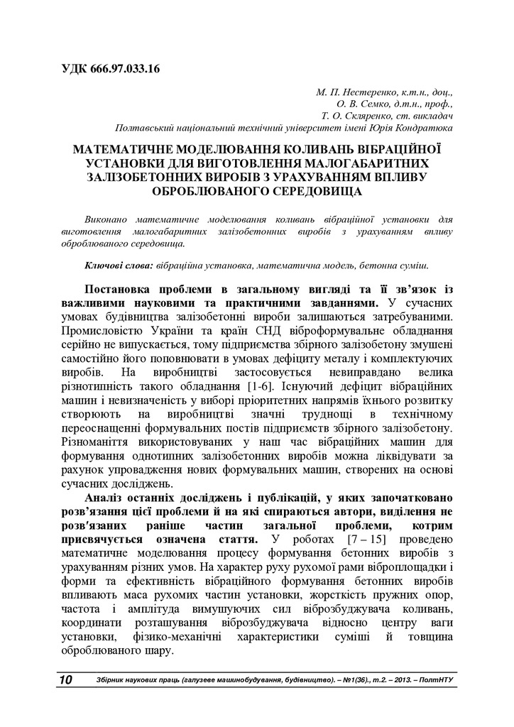 Стаття 2019/05/29Математичне моделювання коливань вібраційної установки для виготовлення малогабаритних залізобетонних виробів з урахуванням впливу оброблюваного середовища