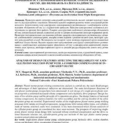 Стаття 2023/06/27Аналіз конструктивних особливостей однопоршневого розчинонасоса з комбінованим компенсатором збільшеного об’єму, що впливають на його надійність