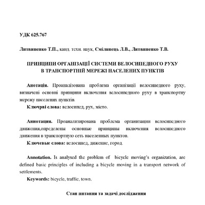 Проаналізована проблема організації велосипедного руху, визначені основні принципи включення вело...