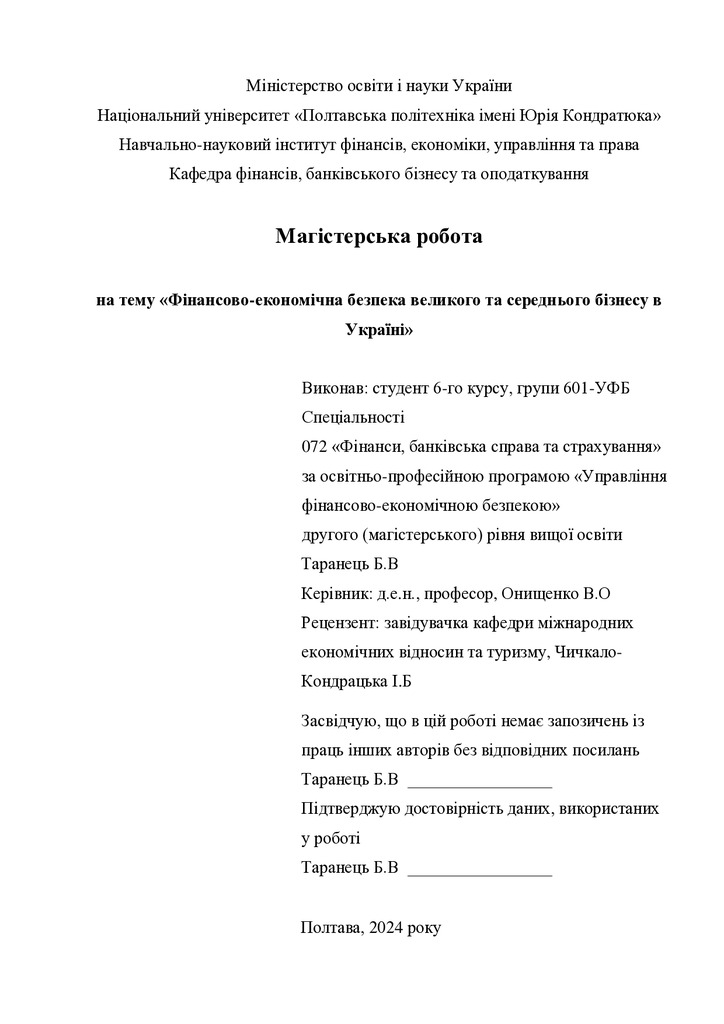 У випускній роботі розглянуто комплекс питань, пов'язаних із визначенням сутності, ролі та складових фінансово-економічної безпеки великого та середнього бізнесу, виокремленню детермінантів фінансо...
