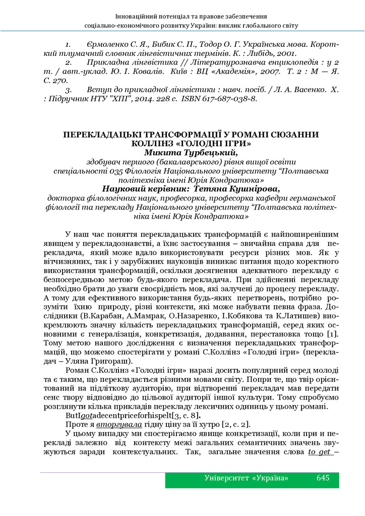 Перекладацькі трансформації у романі Сюзанни Коллінз «Голодні ігри»