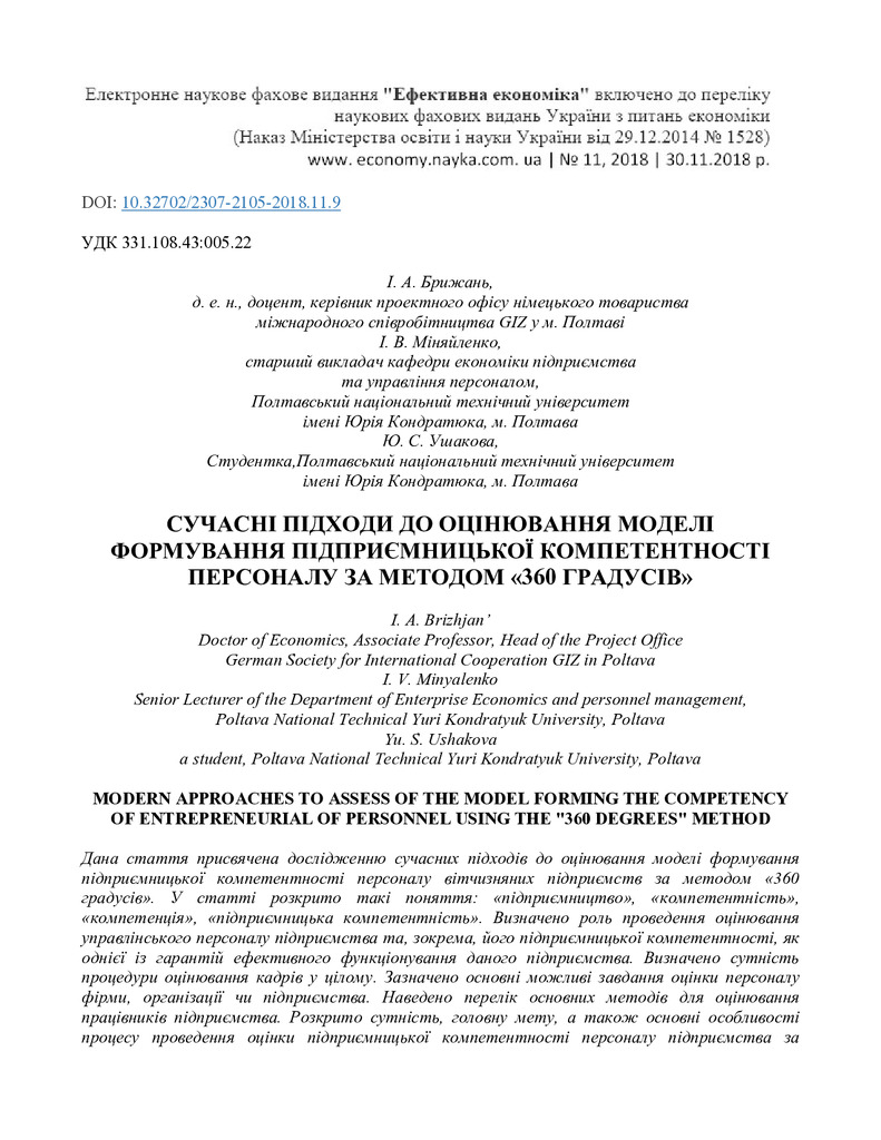 Стаття 2019/01/22Сучасні підходи до оцінювання моделі формування підприємницької компетентності персоналу за методом "360 градусів"