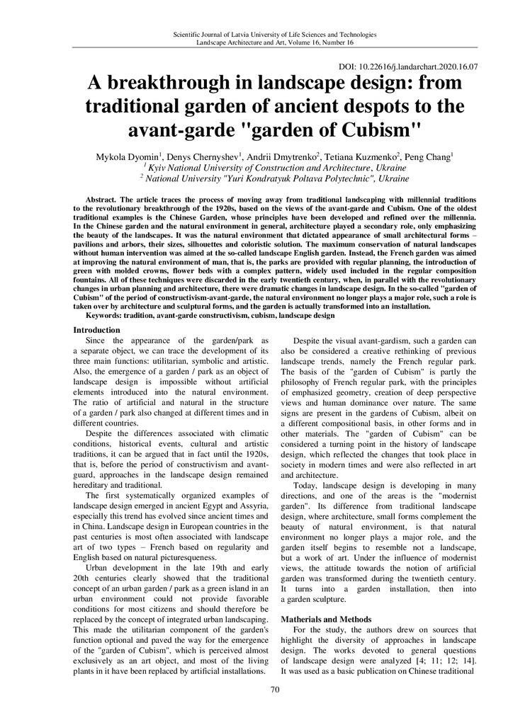 The article traces the process of moving away from traditional landscaping with millennial traditions to the revolutionary breakthrough of the 1920s, based on the views of the avant-garde and Cubis...
