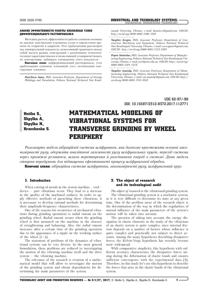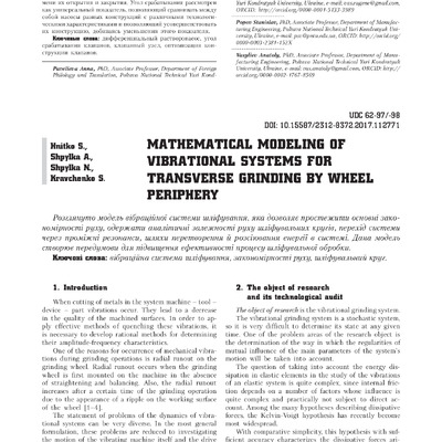 Стаття 2018/12/05Mathematical modeling of vibrational systems for transverse grinding by wheel periphery
