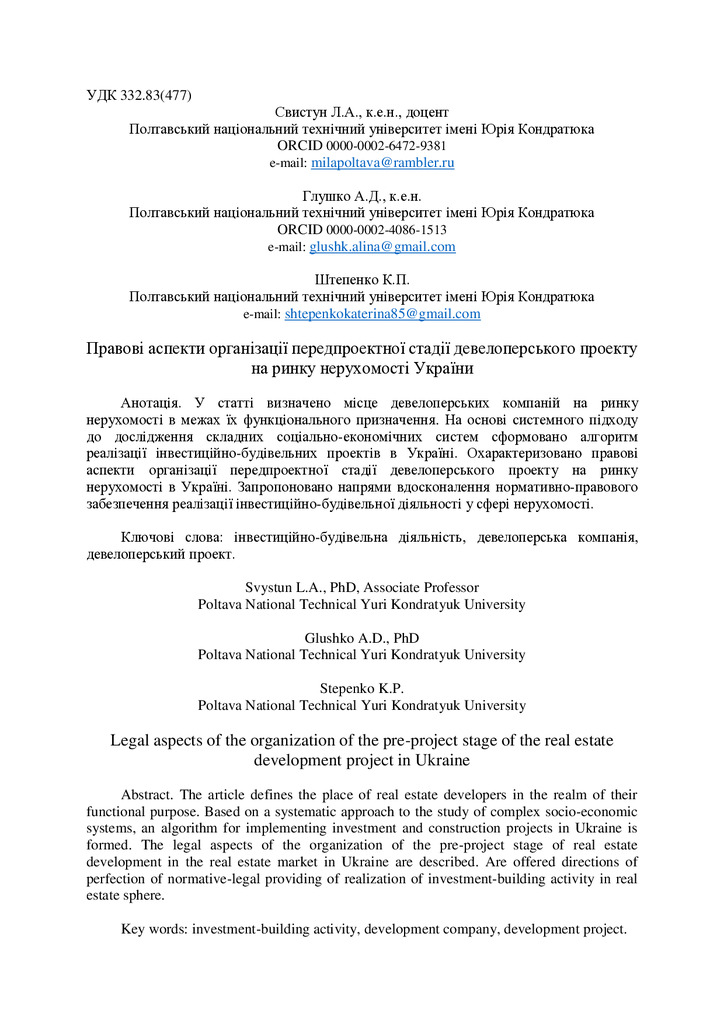 2018/12/07Правові аспекти організації передпроектної стадії девелоперського проекту на ринку нерухомості України