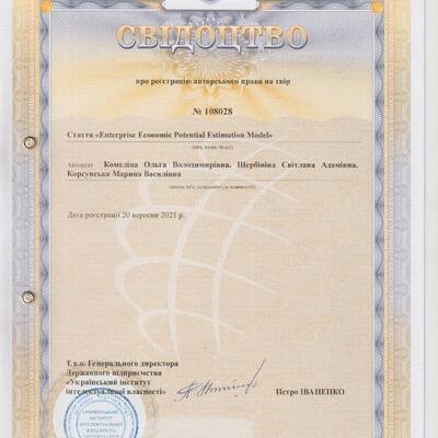 Свідоцтво про реєстрацію авторського права № 108028 на твір «Enterprise economic potential estimation model