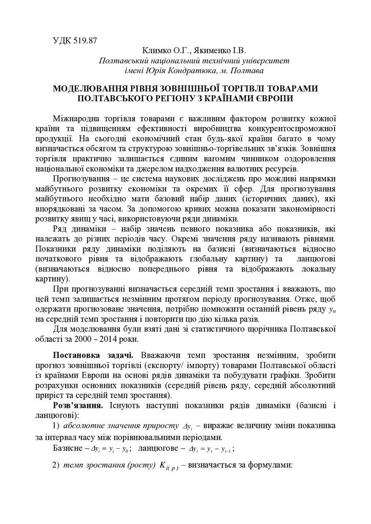 Моделювання рівня зовнішньої торгівлі товарами Полтавського регіону з країнами Європи