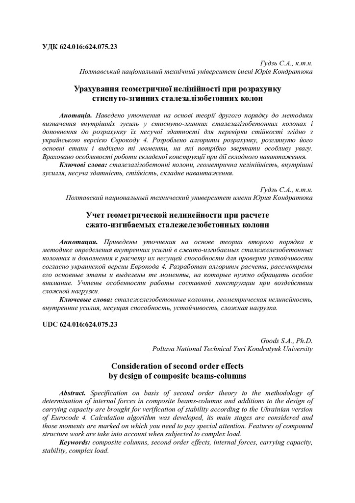 Стаття 2018/09/27Урахування геометричної нелінійності при розрахунку стиснуто-згинних сталезалізобетонних колон