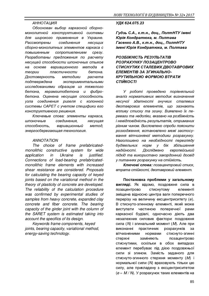 Стаття 2017/07/12Розбіжність результатів розрахунку позацентрово стиснутих сталевих двотаврових елементів за згинально-крутильною формою втрати стійкості