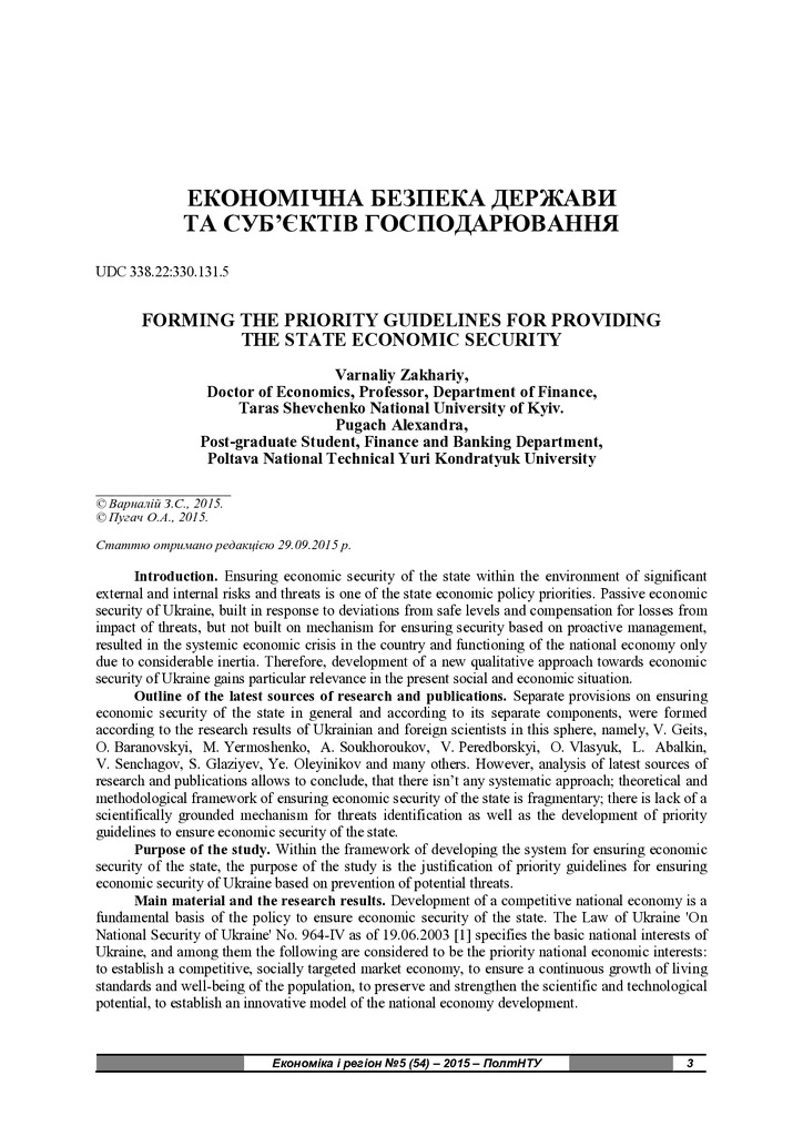 Стаття 2022/06/27Forming the Priority Guidelines for Providing the State Economic Security