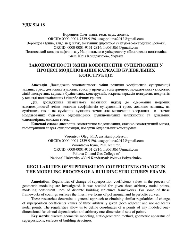 Досліджено закономірності зміни величин коефіцієнтів суперпозиції заданих трьох довільних вузлових точок у процесі геометричного моделювання складових ліній дискретних каркасів будівельних конструк...