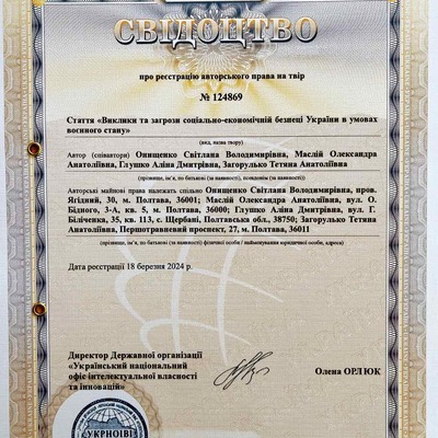 Свідоцтво про реєстрацію авторського права 124869 на твір «Виклики та загрози соціально-економічній безпеці України в умовах воєнного стану»