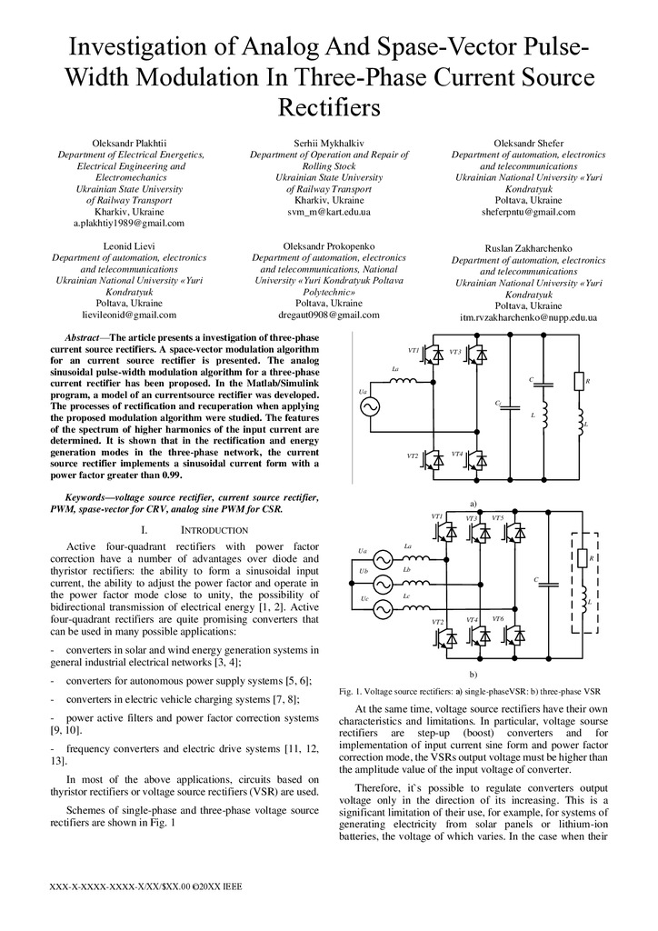 The article presents a investigation of three-phase current source rectifiers. A space-vector modulation algorithm for an current source rectifier is presented. The analog sinusoidal pulse-width mo...