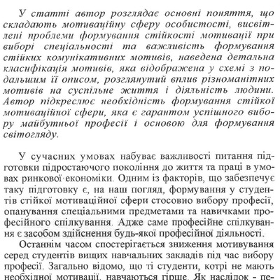 У статті автор розглядає основні компоненти, що складають мотиваційну сферу особистості, розглядає важливість формування стійкочсті мотивації при вибор майбутньої професії.