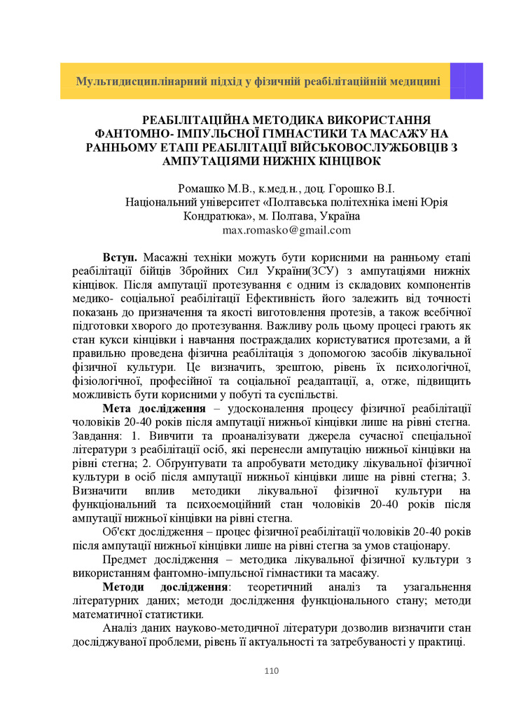 Реабілітаційна методика використання фантомно-імпульсної гімнастики та масажу на ранньому етапі реабілітації військовослужбовців з ампутаціями нижніх кінцівок
