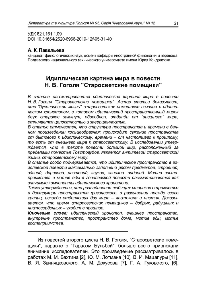 У статті розглядається ідилічна картина світу в повісті М. В. Гоголя «Старосвітські поміщики». Ав...