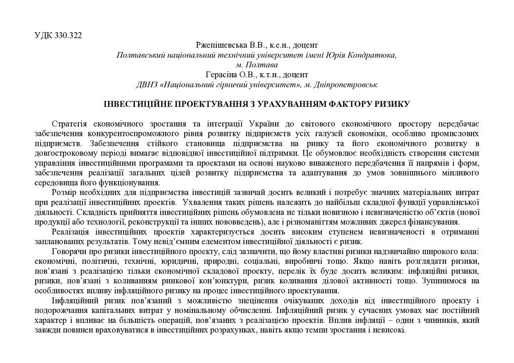 Реалізація інвестиційних проектів характеризується досить високим ступенем невизначеності в отрим...