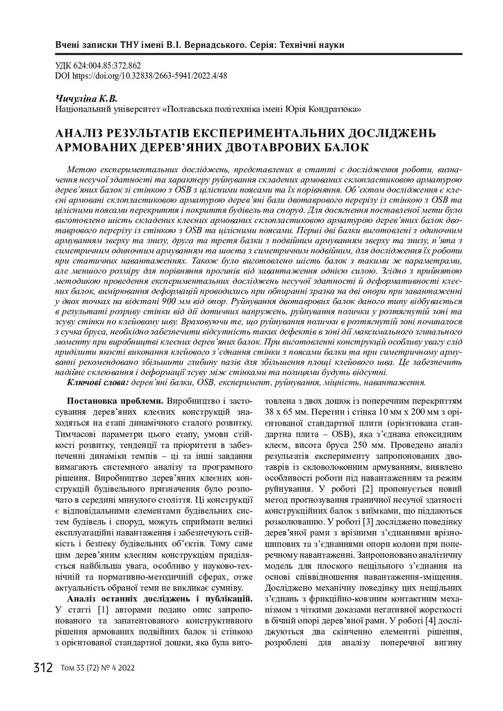 2022/11/18Аналіз результатів експериментальних досліджень армованих дерев’яних двотаврових балок