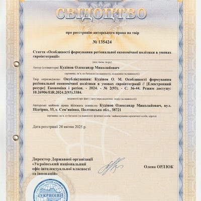 2025/12/11Свідоцтво про реєстрацію авторського права № 135424 на твір «Особливості формування регіональної економічної політики в умовах євроінтеграції»