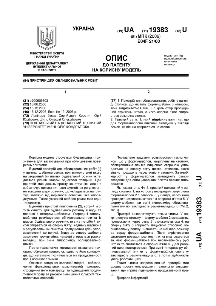 Пристрій для облицювальних робіт: пат. 19383 на корисну модель