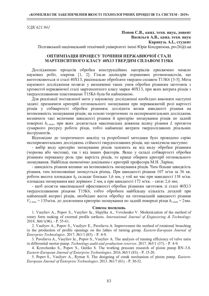 2020/03/03Оптимізація процесу точіння нержавіючої сталі мартенситного класу 40Х13 твердим сплавом Т15К6