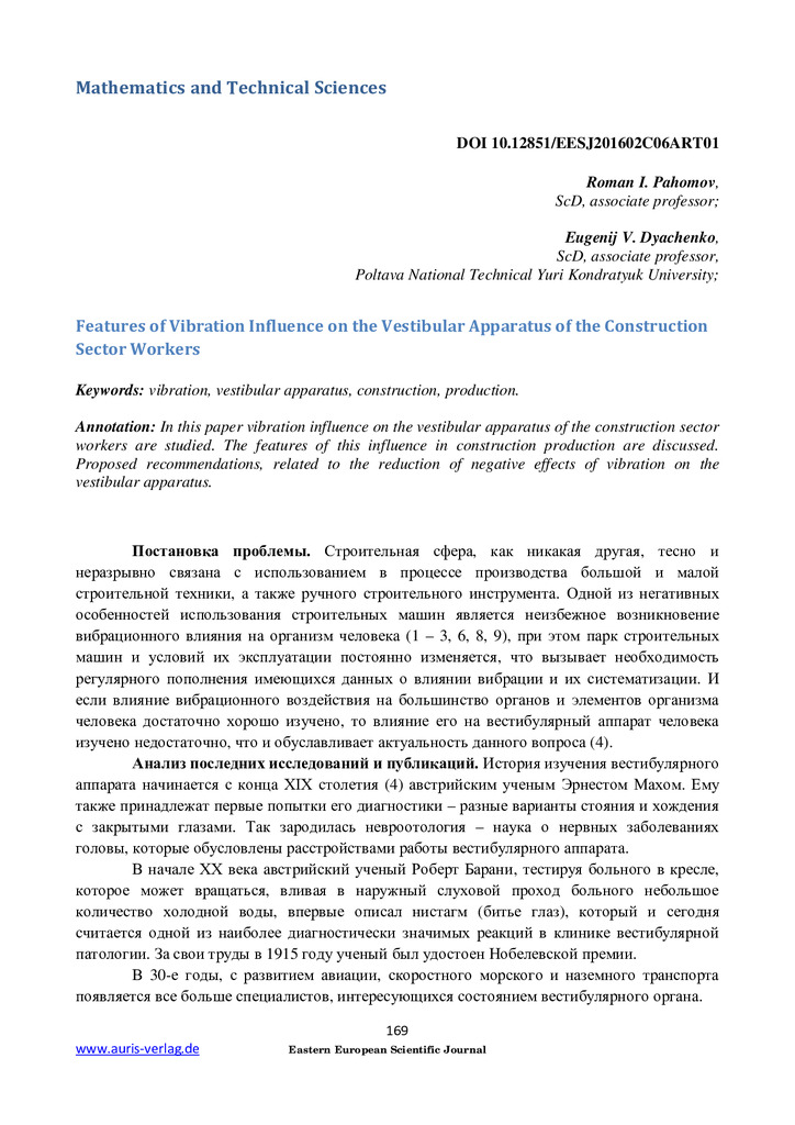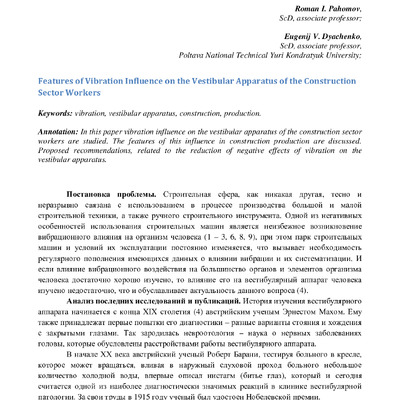 Стаття 2018/06/25Features of Vibration Influence on the Vestibular Apparatus of the Construction Sector Workers