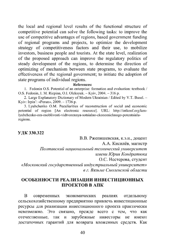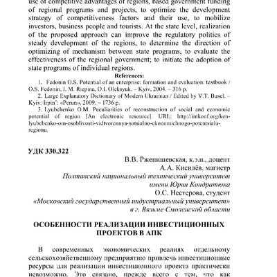 Особенности реализации инвестиционных проектов в АПК