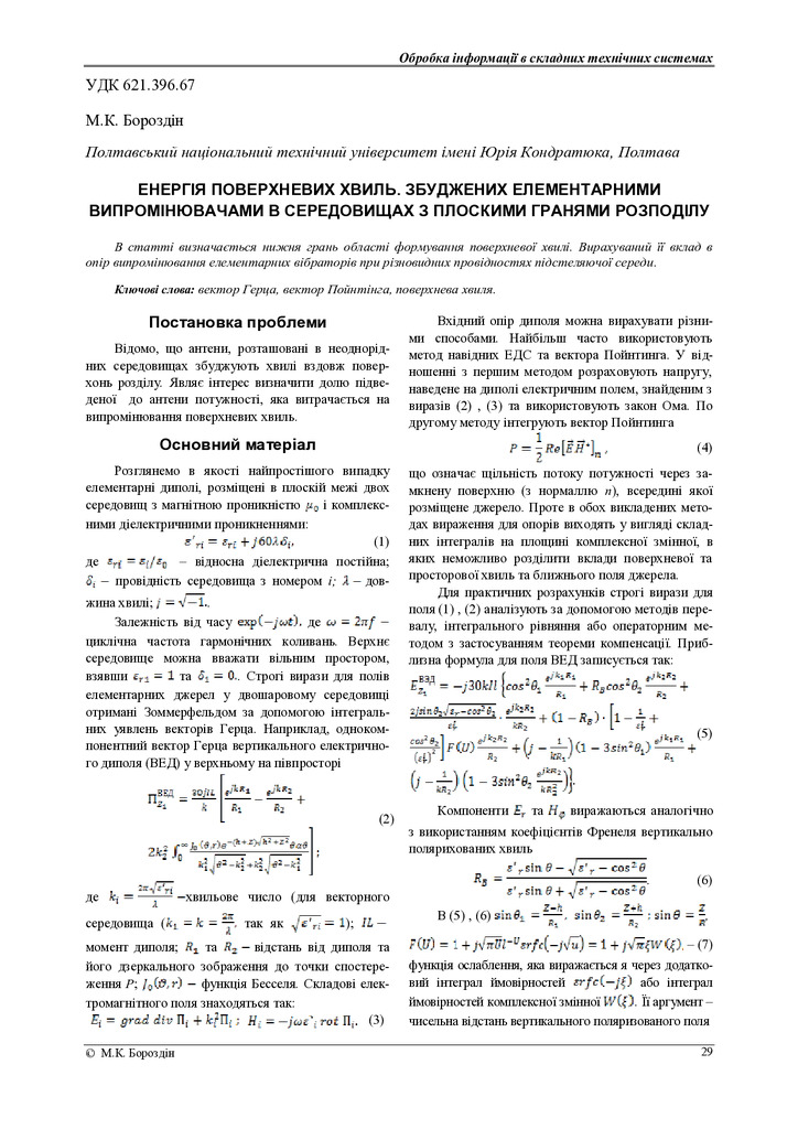 Стаття 2017/12/20Енергія поверхневих хвиль збуджених елементарними випромінювачами в середовищах з плоскими гранями розподілу
