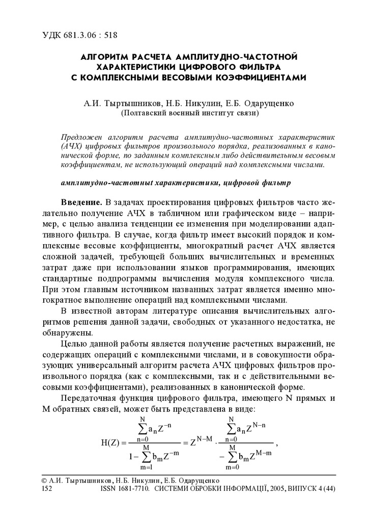Предложен алгоритм расчета амплитудно-частотных характеристик (АЧХ) цифровых фильтров произвольно...