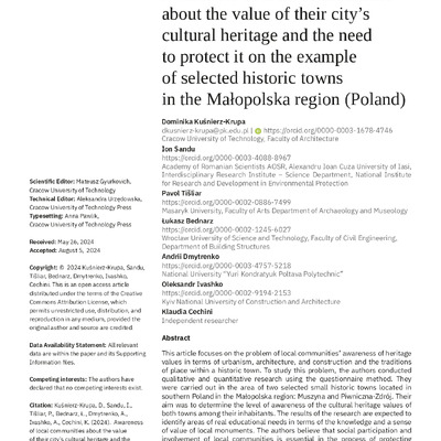 Стаття 2025/12/04Awareness of local communities about the value of their city’s cultural heritage and the need to protect it on the example of selected historic towns in the Małopolska region (Poland)